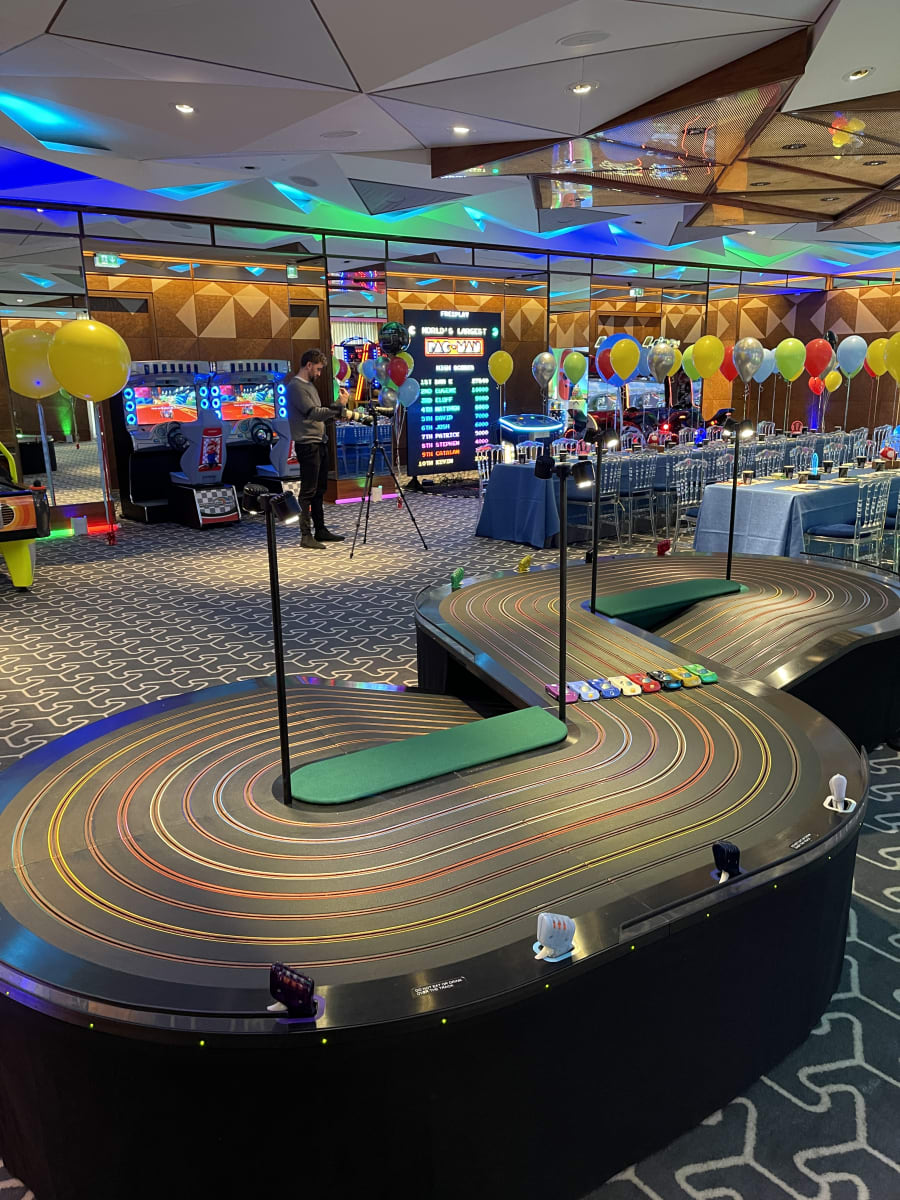Elevate your brand presence with fully customised game setups and branded equipment. From logo wraps on arcade cabinets to branded Scalextric tracks and game signage, we ensure your company stands out while guests engage with your entertainment. Perfect for trade shows, product launches, and corporate events looking for a professional edge.